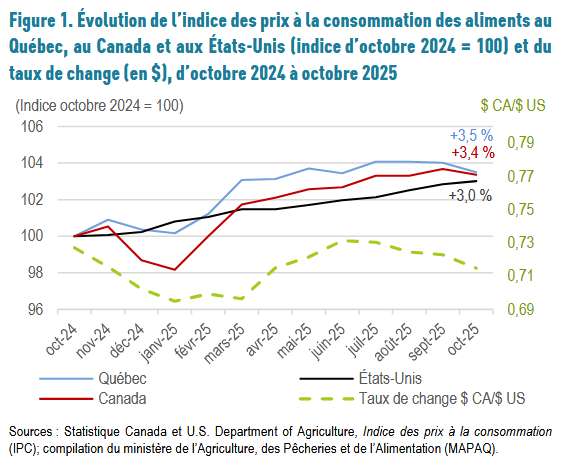 En août 2025, les tarifs américains envers le Canada s’élevaient à 35%. Le gouvernement canadien avait répondu plus tôt à la guerre tarifaire en levant des tarifs sur plusieurs produits, dont le sucre, le cacao, le café, des boissons, de l’alcool et certains produits laitiers, des œufs et de la volaille. Ces événements ont eu pour effet de raviver l’inflation alimentaire qui s’était calmée en début d’année 2025.