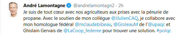 Le ministre du MAPAQ, André Lamontagne, a fait savoir qu’il collaborait avec son collègue du conseil des ministres de Québec, Jonathan Julien qui est ministre de l’Énergie et des Ressources naturelles du Québec, afin de trouver une solution. La ministre fédérale de l’Agriculture, Marie-Claude Bibeau, l’UPA et la Coop fédérée sont également impliqués dans ces discussions.