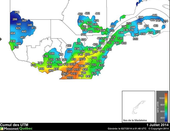 La plupart des cultures au Québec ont récupéré leur retard lié aux semis tardifs. Le nombre de degré-jours dépasse la moyenne pour la plupart des régions de la province alors que les UTM sont supérieurs également aux moyennes historiques à pareille date.