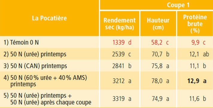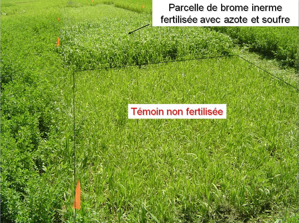 La ferme de recherche en productions végétales de La Coop fédérée à La Pocatière a mené des recherches sur le sujet. Les résultats démontrent que le rendement et le taux de protéine brute de la première coupe ont augmenté de façon significative avec la fertilisation azotée au printemps dans un mélange de brome hybride (12 kg/ha) et de fléole des prés (7 kg/ha).