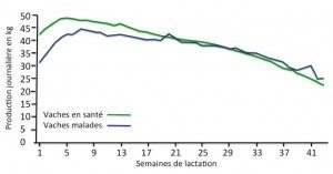 Des chercheurs de l’Université de Colombie-Britannique ont mesuré l’impact de la métrite sur la production laitière en combinant les données de plusieurs études. Les résultats de cet exercice sont présentés à la figure suivante. La consommation et la production des vaches de plus d’un vêlage ayant des pertes vaginales nauséabondes et une température de plus de 39,5 C dans les trois premières semaines de lactation étaient comparées à des vaches saines. La baisse de production s’étendait sur plus de 20 semaines après le vêlage pour les vaches malades et celles-ci avaient presque quatre fois plus de chance d’être réformées que les vaches qui n’avaient pas d’infection. Les raisons de réforme des vaches atteintes de métrite étaient reliées à une faible production de lait et santé et non à des causes de reproduction, car ces vaches étaient réformées avant d’être inséminées. De plus, les vaches qui développaient une métrite après le vêlage passaient moins de temps à la mangeoire et consommaient moins d’aliments avant le vêlage que les vaches en santé.