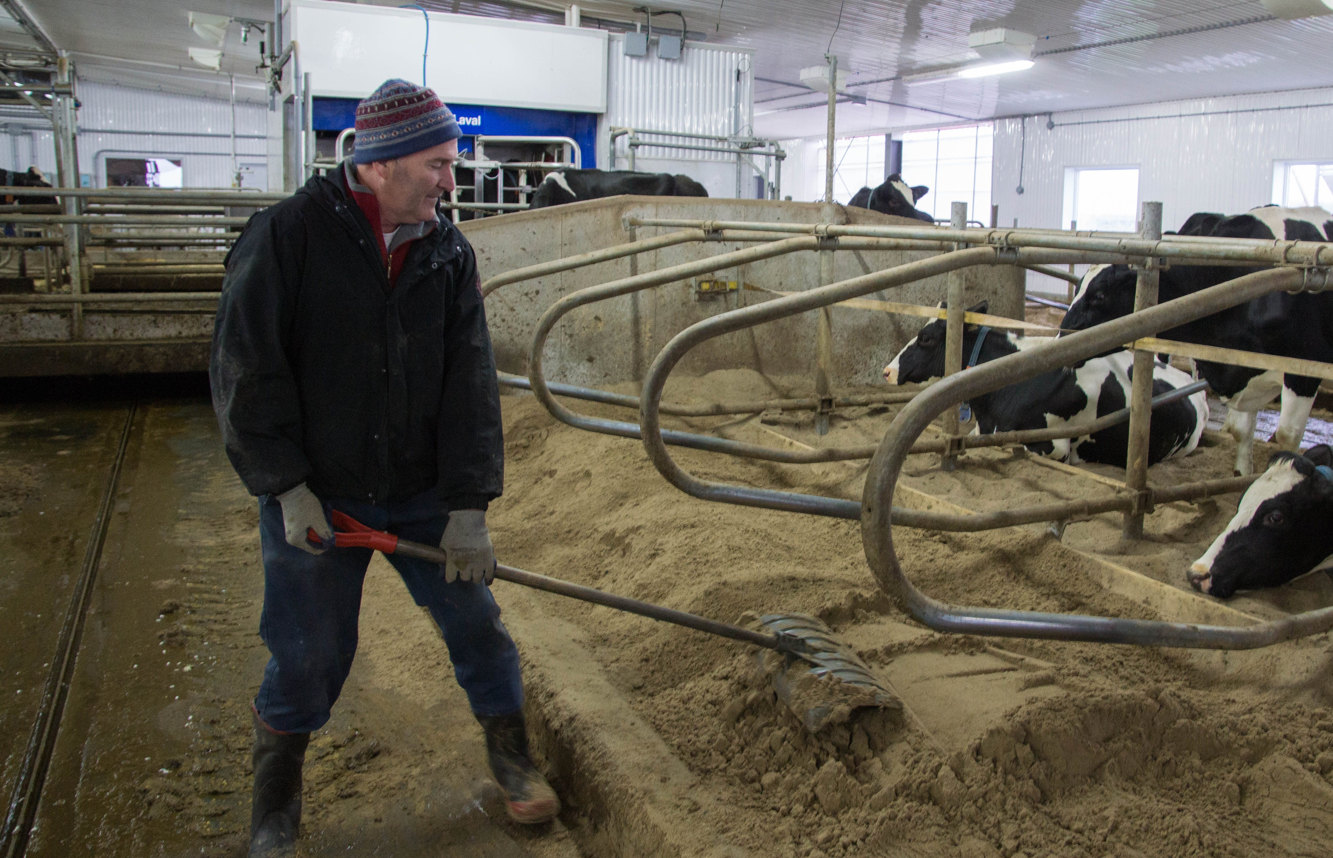 Pour remplir les allées de sable, l’espace réservé aux logettes des vaches est divisé en deux allées. Martin Caron bloque une des allées et déplace les vaches de cette partie dans l’allée d’alimentation et dans un autre espace réservé à cet effet. Pendant ce temps, Danny Giguère remplit les stalles de sable à l’aide d’un petit tracteur de type « bobcat ». Celui-ci est muni d’un convoyeur latéral actionné par une pompe hydraulique. Les stalles de l’autre allée sont comblées de sable la semaine suivante. L’opération ne dure chaque fois qu’une heure. Le grattage des bouses dans les stalles est réalisé deux à trois fois par jour.