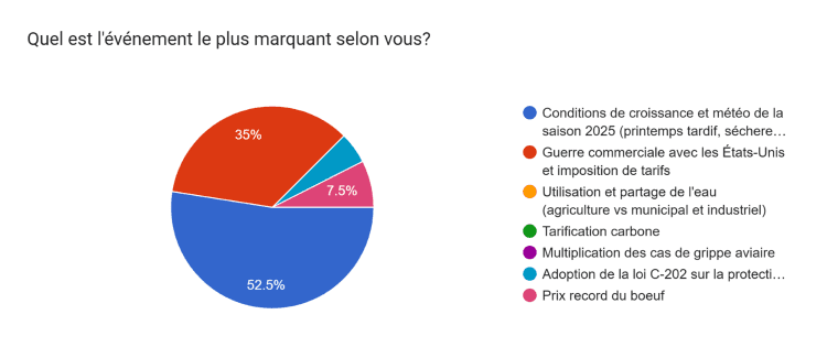 La guerre commerciale avec les États-Unis et l’imposition des tarifs a obtenu pour sa part 35% des votes. Depuis l’annonce des tarifs américains le 1er avril sur ses partenaires commerciaux, le sujet a fait les gros titres tout au long de l’année. Les actions des États-Unis ont mené à une escalade avec la Chine. Cette dernière a d’ailleurs cessé l’achat de soya américain, poussant le gouvernement de Trump a accordé une aide spéciale de 12 G$US pour les producteurs agricoles. Les denrées agricoles canadiennes ont été en partie exemptées des tarifs de 25% appliqués au Canada, étant protégées par l’ACEUM, mais d’autres n’ont pas eu cette chance, comme par exemple le sirop d’érable.