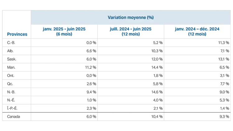 L’augmentation depuis janvier 2025 varie toutefois selon les provinces. Au Québec, elle a été chiffrée à 2,6 % pour les six premiers mois de l’année, tandis qu’elle a grimpé de 11,2 % au Manitoba et de 9,4 % au Nouveau-Brunswick. De l’autre côté du spectre, elle s’est avérée nulle en Ontario et en Colombie-Britannique et de seulement 1 % en Nouvelle-Écosse.