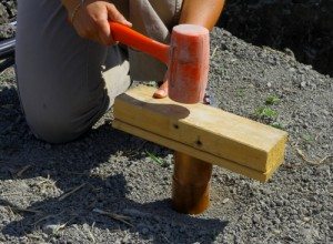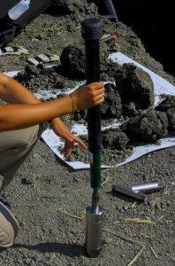 À l’aide d’un marteau, on enfonce un cylindre à densité (un tuyau de cuivre dans ce cas-ci) dans le sol, jusqu’à ce qu’il soit bien rempli. Plus la densité du sol collecté est élevée, plus le sol est compacté. Pour mesurer la densité, on pèse la terre, puis on divise ce poids par le volume du cylindre. Pour une mesure plus précise, on fait d’abord sécher la terre en la chauffant à 105oC.