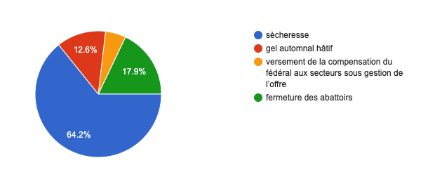 C’est finalement la sécheresse qui a remporté le plus grand nombre de votes avec un pourcentage de plus de 64%. La fermeture des abattoirs a suivi avec presque 18% des votes. Le gel hâtif a pris la troisième place avec 12, 6% tandis que la compensation ferme la marche.