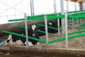 Les vaches ont également droit à des stalles flexibles en PVC. Il s’agit de la première ferme au Québec à en avoir. Avec ces stalles flexibles, les vaches ont plus de mobilité pour se coucher et se retourner. Elles se blessent moins en général. D’ailleurs, l’étable n’a pas de nettoyeur mécanisé également dans le but de protéger les animaux des blessures. Le fumier est gratté à l’aide d’un chargeur pendant la traite des vaches.