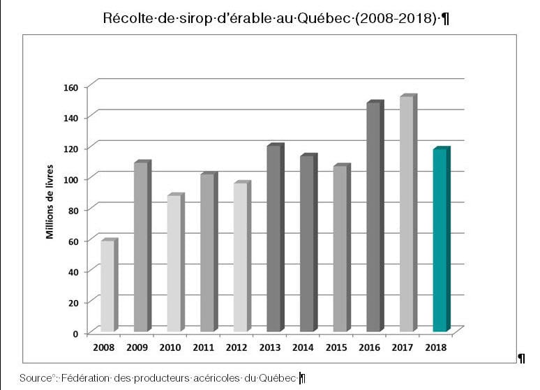 En résumé, les ?13 700 acériculteurs du Québec ont récolté 118 millions de livres de sirop d’érable avec 46,8 millions d’entailles, soit une diminution de 22,4% par rapport au record de 152,2 millions de livres de 2017. La Fédération a qualifié la production de faible avec un chiffre moyen de 2,52 par entaille. La production a reculé de 34 millions malgré l’ajout de 2,5 millions d’entailles dans les dernières années. Il s’agit tout de même d’un chiffre reflétant la production moyenne depuis une dizaine d’années, soit entre 100 et 120 millions de livres. Sur dix ans, la production s’est située en deçà du 100 millions de livres en 2012,2010 et 2008.