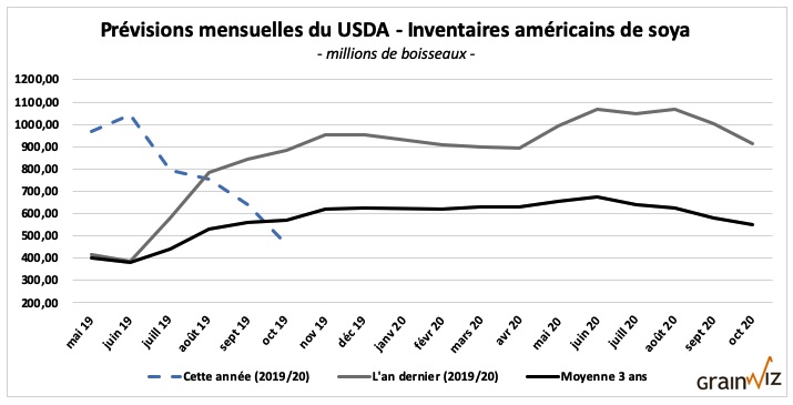 À tout ceci s’ajoute bien entendu la récente révision à la baisse de la récolte et des stocks américains de la dernière année. Au net, nous nous retrouvons donc avec des stocks américains pour la prochaine année qui ont fondu de plus de 1 milliard de boisseaux à moins de 500 millions de boisseaux. Oui, c’est la moitié de moins que ce qui était initialement prévu, et un recul annuel pratiquement équivalent des stocks américains de soya.