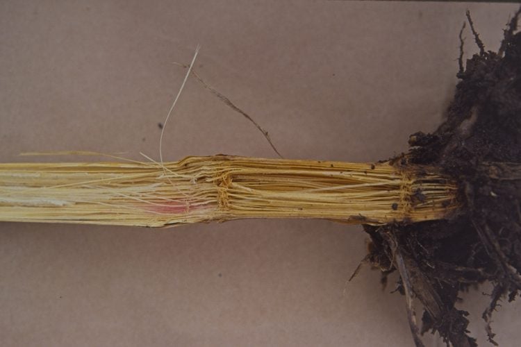 Enfin, comme mentionné dans un précédent article, une plante de maïs qui dépérit prématurément risque de voir sa tige envahie par des pathogènes du sol. La décoloration rosée observée à l’intérieur de la tige révèle souvent la présence de Fusarium capable de produire des mycotoxines.