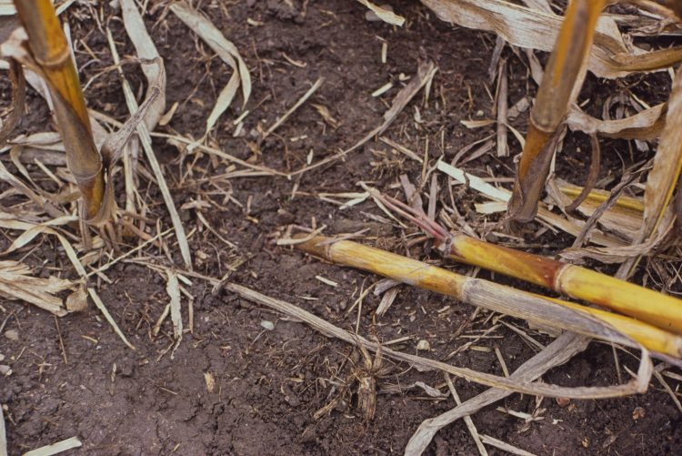 Lorsqu’un stress majeur survient en phase de remplissage du grain, toute perte de photosynthèse se traduit par une remobilisation accrue pour maintenir la croissance du grain à environ 5 g de matière sèche par jour et par épi. Si la photosynthèse chute au point de surtaxer ce mécanisme, un effet boule de neige s’installe. Il en découle une sénescence des feuilles et des tiges qui à son tour mène à la mort prématurée de la plante. Cet affaiblissement rend alors le maïs plus vulnérable aux pathogènes qui pénètrent par la base et colonisent la tige. L’anthracnose, en revanche, suit une trajectoire particulière puisqu’elle s’installe d’abord dans la feuille étendard avant de progresser vers le bas.