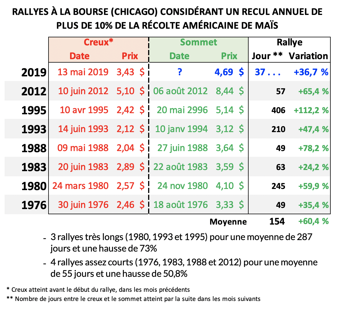 En jetant ensuite un coup d’œil au creux précédent les rallyes au cours de ces années à la bourse, et les sommets atteints par la suite, on obtient des informations qui nous permettent ensuite de mieux nous structurer dans la vente de son maïs cette année :