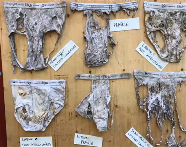 L’effet des cultures de couverture a également fait ses preuves vis-à-vis les maladies et les mauvaises herbes. Dans le premier cas, les populations d’organismes utiles augmentent et permettent de combattre les maladies en produisant des substances qui détruisent les pathogènes du sol. La couverture végétale va, quant à elle, compétitionner avec les mauvaises herbes, augmenter l’activité microbienne et produire des substances allélopathiques qui affectent la germination et la croissance des indésirables. Plus l’activité microbienne dans un champ est élevée, moins la biomasse des mauvaises herbes est importante, note Sylvie Thibaudeau. Elle préconise une manière simple, mais efficace pour vérifier l’activité dans les champs, soit l’enfouissement de caleçons en coton.