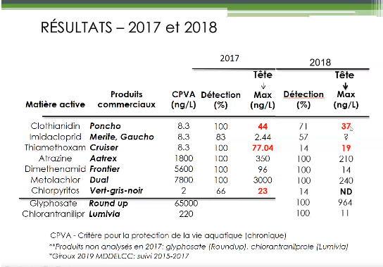 Dans le cadre de ce même projet pilote, les résultats de 29 producteurs provenant de trois groupes conseils en Montérégie ont été comparés à ceux de 17 producteurs, provenant principalement de Agri Conseils Maska. Le projet mené durant trois ans visait à réduire l’impact des pesticides dans le bassin versant de la Rivière des Hurons Nord. Patricia Leduc, agronome, conseillère à Agri Conseils Maska, a expliqué que le projet tentait d’évaluer la gestion des pesticides et son lien avec la santé du cours d’eau en utilisant l’IRPeQ. La combinaison de deux programmes, dont Prime-vert, a assuré le volet financier du projet qui a permis de mettre sur pied un plan d’action adapté à chacun (avec le support du MAPAQ). Durant le projet qui visait l’amélioration du volet phyto-protection, plusieurs producteurs ont amélioré leurs connaissances sur la santé des sols (historique des champs, etc.), le calibrage de leur machinerie, ainsi que le dépistage. Le bilan sur deux ans indique une diminution notable des différentes matières actives dans l’eau et une amélioration de l’IRPeQ.