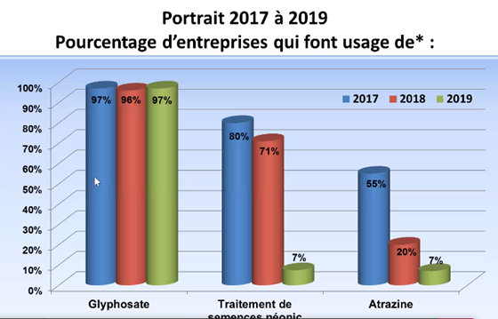 Après trois ans, la diminution sur les traitements de semence insecticide dans le soya était de 28%, tandis que ce taux avait reculé de 20% dans le cas du maïs. L’utilisation des diamides est en hausse et la plupart des entreprises qui traitent 100% de leurs superficies avec des insecticides de semence y ont recours. Sur les 121 entreprises, 7% avaient utilisé de l’atrazine en 2019, contre 80% deux ans plus tôt. L’utilisation du glyphosate est demeurée inchangé.