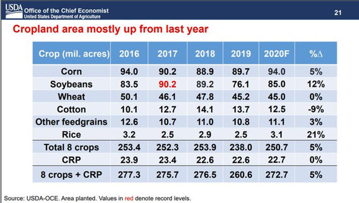 Du côté des céréales, le gouvernement américain voit une remontée dans les superficies de soya qui devraient augmenter en 2020 de 12%. Elles passeraient à 85 millions d’acres contre 76,1 millions en 2019. Les champs ensemencés en maïs augmenteraient plus légèrement de 5% à 94 millions d’acres (89,7 millions d’acres en 2019). Les superficies de blé demeureraient stables à 45 millions d’acres.