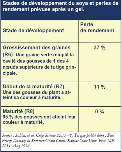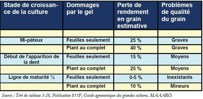 Un tableau fourni par Dekalb permet de se faire une idée des possibles dommages, selon l’avancement des plants. Il faudra, par contre, quelques jours (cinq à sept jours) avant de prendre la mesure de l’impact du gel sur les plants. Même si les feuilles montrent des signes d’avoir été atteintes, il faut examiner les tiges, le pédoncule et les parties du plant pour constater jusqu’où le gel s’est avancé.