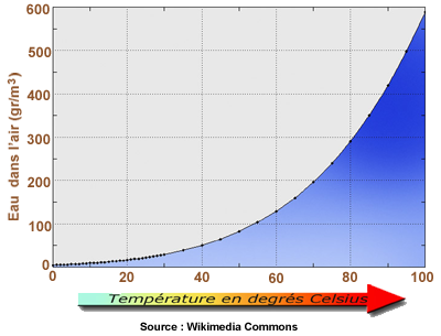 La capacité de l’air à transporter de l’eau varie énormément en fonction de sa température. Et quand on passe sous les 0°C, la quantité d’eau devient plutôt négligeable. Si on illustre cette situation dans un graphique, on voit très bien le phénomène. Tout cela pour dire que l’humidité relative de l’air en hiver, eh bien dans les faits, on ne s’en occupe pas.