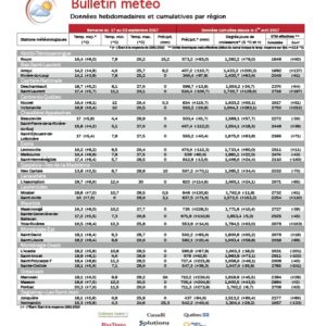 Consultez en ligne notre nouveau bulletin météo. Il résume par région les écarts de températures et les quantités de précipitations pour chaque semaine. Le bulletin météo vous informe sur le cumul des degrés-jours et des unités thermiques pour le maïs. En plus, vous pouvez comparer l’accumulation des jours de croissance par rapport à la moyenne des dernières années. Une information très utile pour gérer vos cultures.