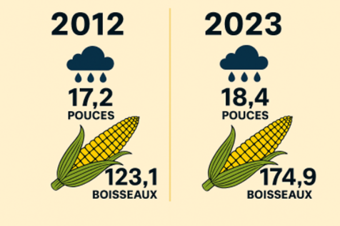 Comparaison du rendement moyen de maïs pour des précipitations similaires en 2012 et 2023. (Source : Farm Journal)