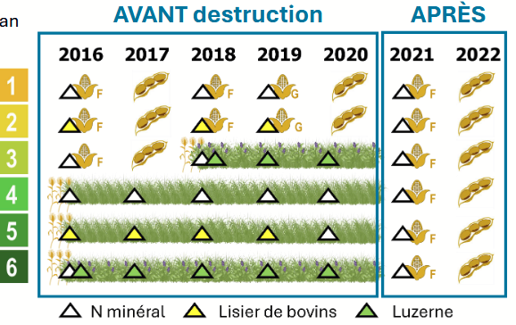 La rotation 3, avec trois années de plantes fourragères, visait à répondre à la question des producteurs à savoir si ce nombre d’années est suffisant pour tirer des bénéfices d’une prairie, même si les coûts sont souvent importants à l’implantation.