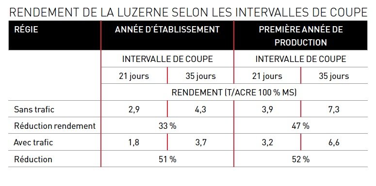 Dan Undersander de l’Université de l’État du Wisconsin a repris une étude réalisée en 2000-2001. Des intervalles de coupe de 21 et 35 jours étaient imposés à plus de 20 différents cultivars de luzerne. De plus, les parcelles comparaient une régie avec et sans circulation pour comparer les effets du passage de la machinerie sur le rendement et la survie des prairies. Le rendement moyen de ces cultivars est présenté dans le tableau ci-dessous.