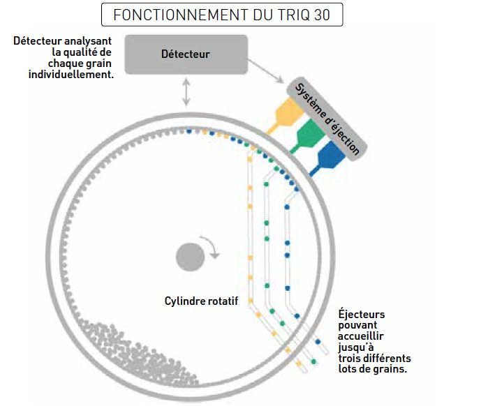 La plupart des équipements de criblage des grains utilisent la forme, la couleur, la grosseur ou la densité des grains pour séparer les lots. Parfois, les grains infectés par le champignon causant la fusariose et qui ont un contenu élevé en toxines n’affichent pas de symptômes importants et ne sont pas décelés avec ces équipements. Le TriQ 30 utilise les rayons proches infrarouges pour examiner l’intérieur des grains et ainsi déterminer la qualité des grains, dont le contenu en protéines et en toxines (DON). Par la suite, un système d’air comprimé élimine les grains non conformes. Des clients de l’Ouest canadien ont utilisé ces machines pour traiter des lots de grains déclassés. Une analyse standard a révélé un contenu moyen de 9,8 ppm de DON. Après traitement, ce même lot a été divisé selon différents critères de qualité : 4 % du lot contenait 145,4 ppm, 5 % testait 50,4 ppm et 14 % testait 13,6 ppm, mais 71 % testait moins de 2,2 % ppm. « Nous avons pu valoriser environ 70 % du lot de grains du producteur », rapporte Per Söderström, directeur du marketing pour BoMill.