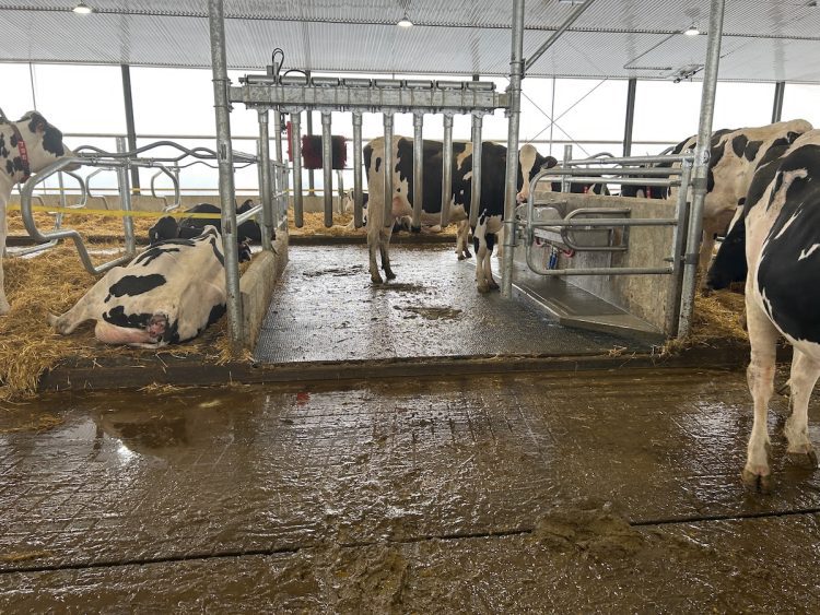 L’étable compte 110 logettes pour les vaches en lactation et est prévue pour un quota de 200 kg de matière grasse par vache par jour. La ferme compte 80 vaches actuellement.