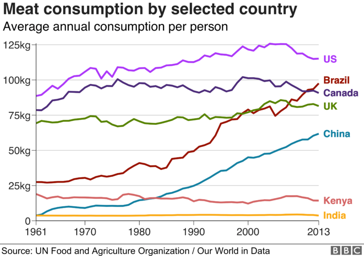 Au Brésil,la consommation a explosé du double depuis les années 90. Même scénario en Chine où la consommation de viande était de moins de 5 kilos par personne à la fin des années 60 alors qu’elle a triplé depuis la fin des années 80 pour atteindre plus de 60 kilos par personne.
