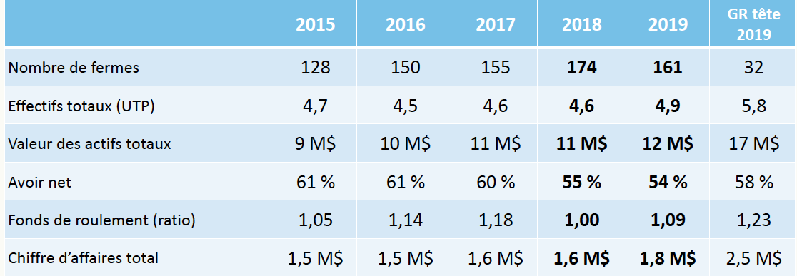 Les 161 entreprises de plus de 100 vaches qui ont fait partie de l’analyse de groupe engagent plus de main d’œuvre pour un total de 4,9 UTP. Les actifs totaux sont en croissance pour atteindre 12 millions de dollars en 2019, alors que l’avoir nette diminue pour se situer à 54%. Le fonds de roulement est plus ou moins stable au cours des années à 1,09. De son côté, le chiffre d’affaires total est en croissance pour se situer à 1,8 millions de dollars.