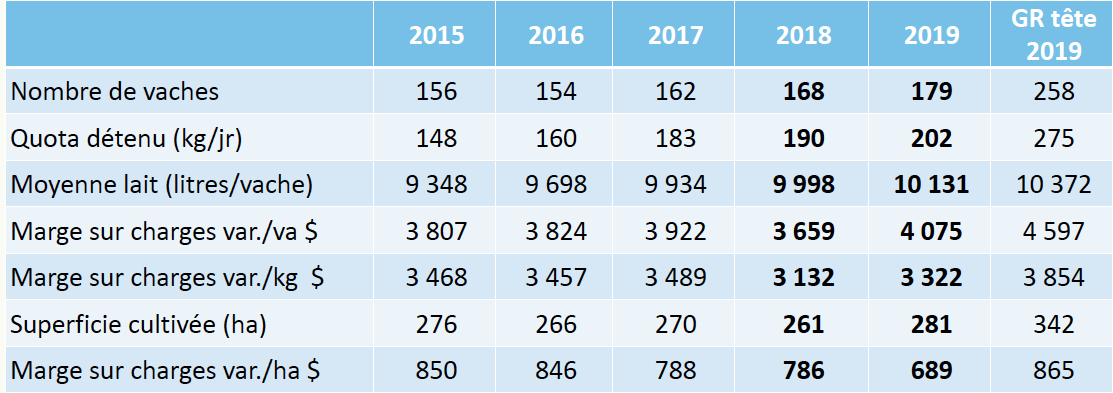 Le nombre de vaches et le quota continue d’augmenter, soit 179 vaches pour 202 kg de quota détenu. La production laitière a franchi la barre des 10 000 litres par vache, soit 10 131. Les superficies cultivées sont aussi en augmentation pour se situer à 281 hectares.