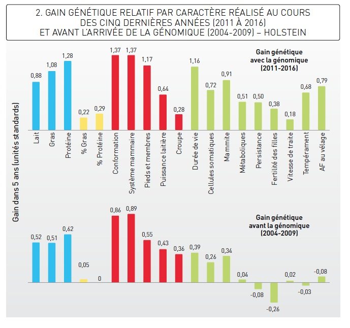 -Les gains génétiques se sont accentués pour tous les caractères, incluant les caractères fonctionnels (traits en vert) à plus faible héritabilité comme la fertilité des filles. Ils s’expliquent par la hausse de la précision des évaluations génétiques due à la génomique.