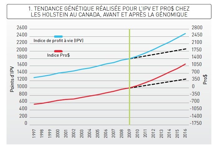Avant la génomique, l’indice de profit à vie (IPV) moyen des femelles augmentait de 50 points par année. Chez les femelles nées au cours des cinq dernières années, l’IPV moyen a augmenté de 107 points annuellement. Une tendance encore plus marquée est observée selon l’indice de sélection Pro$, puisque le taux de progrès annuel est passé de 79 $ avant la génomique à 176 $ par année au cours des cinq dernières années.