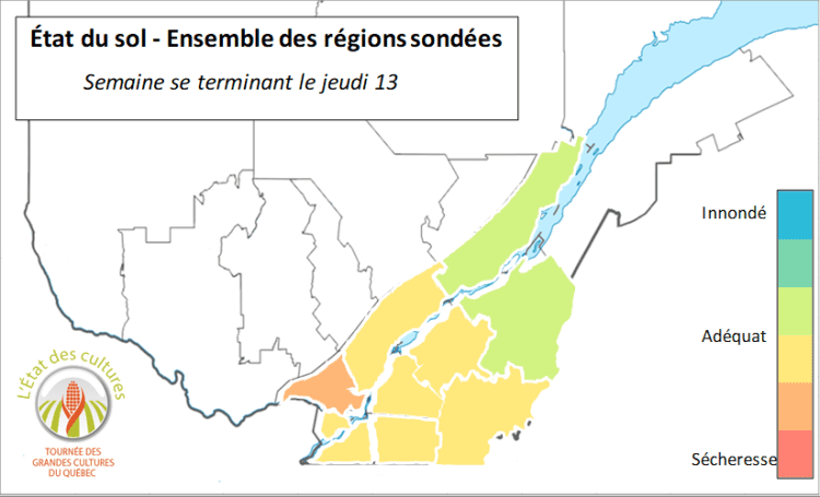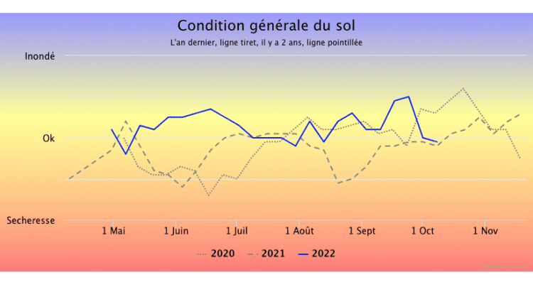 Sans surprise, avec les conditions généralement plus sèches depuis 2 semaines, notre indice de condition du sol se maintient de son côté dans un état jugé « correct », ce qui est comparable à l’an dernier, et nettement moins humide qu’il y a deux ans.