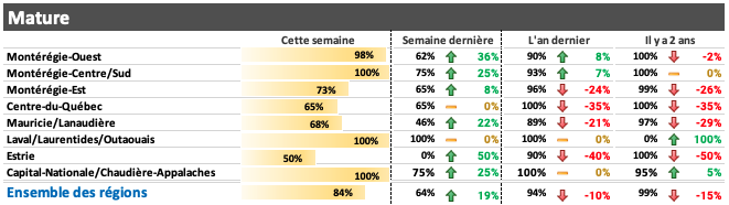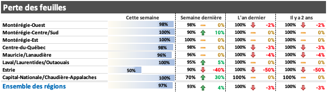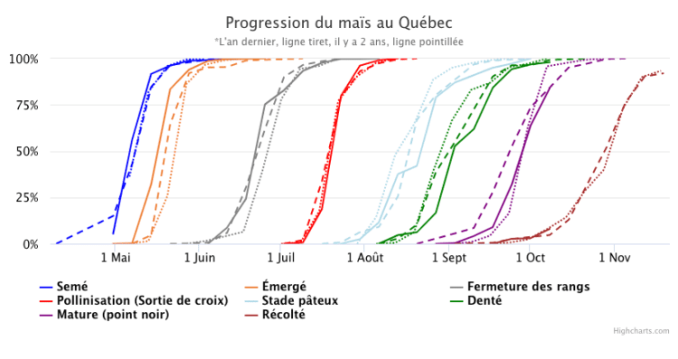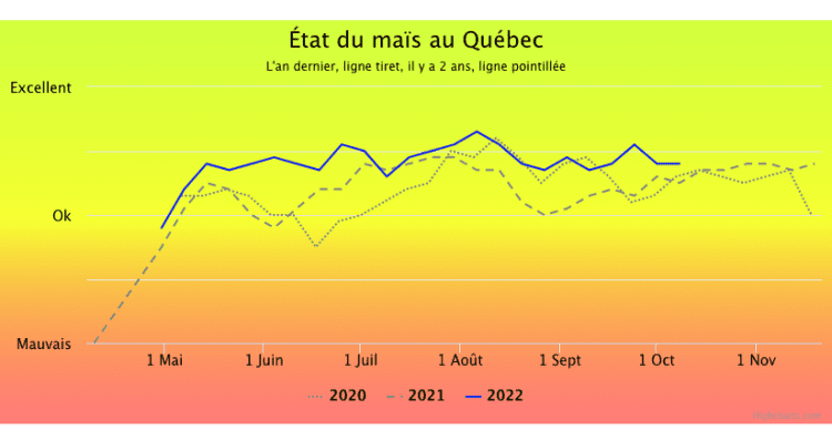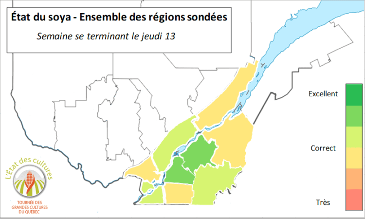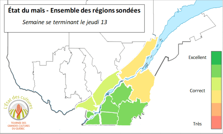 Ceci trouve toujours écho dans notre indice de l’état des cultures du maïs. On constate encore cette semaine une lecture de « correct à bon », ce qui est comparable à il y a 2 ans, et mieux que l’an dernier où on jugeait plutôt l’état des cultures de maïs comme « correct » à ce moment-ci.