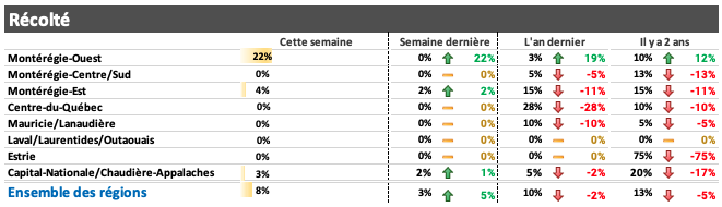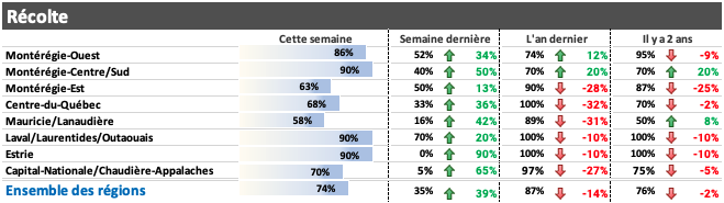 Malgré quelques averses dispersées dans la dernière semaine, les conditions ont été dans l’ensemble très favorables pour accélérer la récolte dans le soya. Celle-ci passe donc maintenant à 74% de complétée, un bond considérable de 39% par rapport à la semaine dernière. Il s’agit cependant d’un recul de 14% par rapport à la mi-octobre l’an dernier, mais un résultat pratiquement ex-aequo avec ce qui était observé il y a deux ans. Considérant le retard observé dans le développement du soya pratiquement tout au long de la saison, cette fin de saison plus rapide est intéressante.
