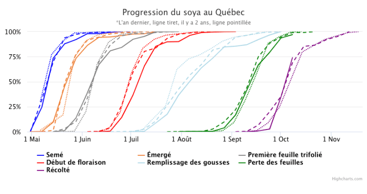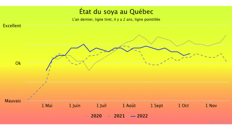 Si on se fie à ces commentaires et aux observations recueillies jusqu’à présent, avec la récolte de soya qui tire à sa fin, on peut déjà s’accorder à dire que le rendement moyen obtenu sera dans l’ensemble dans à sous la moyenne des dernières années qui est de 3 tonnes/ha. Ceci concorde avec ce qui avait été évalué lors de la Tournée des Grandes Cultures à la fin août dernier.