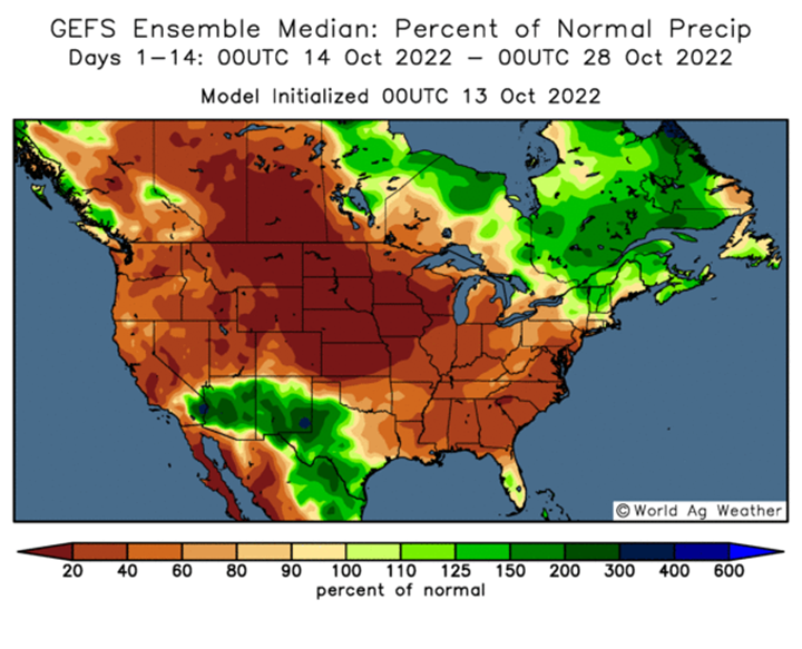 Les dernières prévisions proposent pour les 7 prochains jours de bonnes précipitations, avec un cumulatif allant jusqu’à 75-100 mm d’eau selon les régions. Sur un horizon de 14 jours (carte ci-joint), les prévisions proposent aussi des précipitations de 10 à 50% au-dessus des normales…