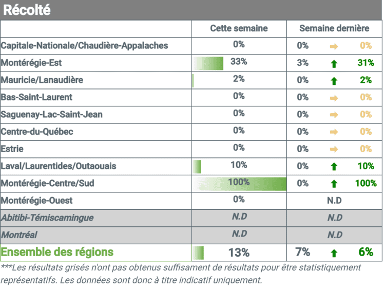L’état des cultures du maïs et du soya est demeuré stable cette semaine à plutôt bon pour le maïs, alors qu’il est jugé majoritairement adéquat pour le soya. L’état du blé d’automne et du blé de printemps ont fait une chute drastique, passant sous la barre d’un état jugé «correct». L’état du blé de printemps est même jugé mauvais en Montérégie Ouest et au Centre-du-Québec. Carences et maladies se confirment dans toutes les cultures, particulièrement où les sols sont mal drainés.