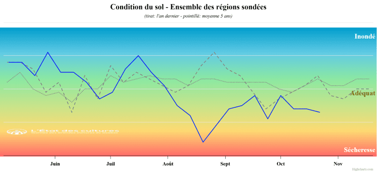 La grande absente des derniers mois (vous aurez reconnu la pluie), sera de retour la semaine prochaine, mais toujours pas en grande quantité. Les prévisions à plus long terme laissent entrevoir un mois de novembre plus humide. En attendant, les conditions de sol sont sèches, mais permettent tout de même d’avancer plusieurs travaux au champ.