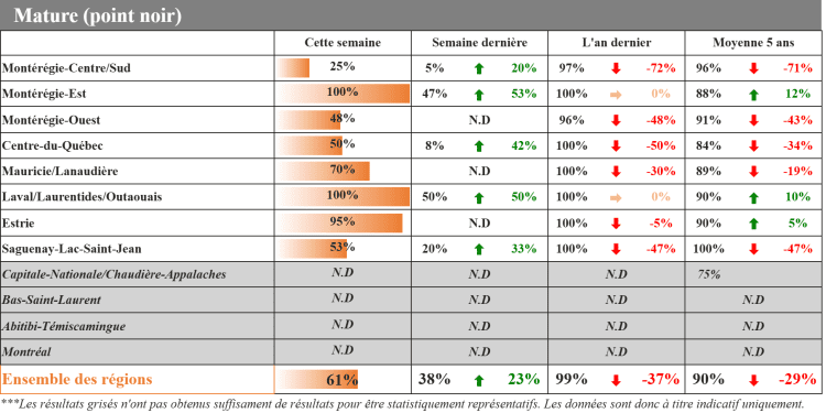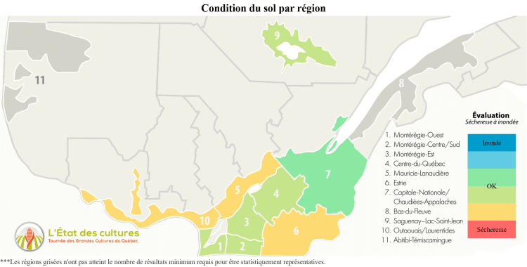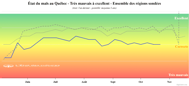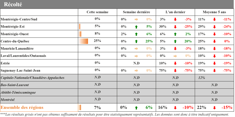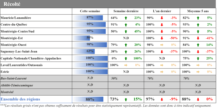 Près de 90 % des récoltes de soya sont complétées chez nos répondants et devraient se terminer au cours des prochains jours. C’est une hausse de 15 % par rapport à la semaine dernière. La sécheresse aura eu raison des rendements dans le soya cette année. Son état est jugé adéquat par la majorité, mais mauvais par nos répondants de la région Outaouais/Laurentides.