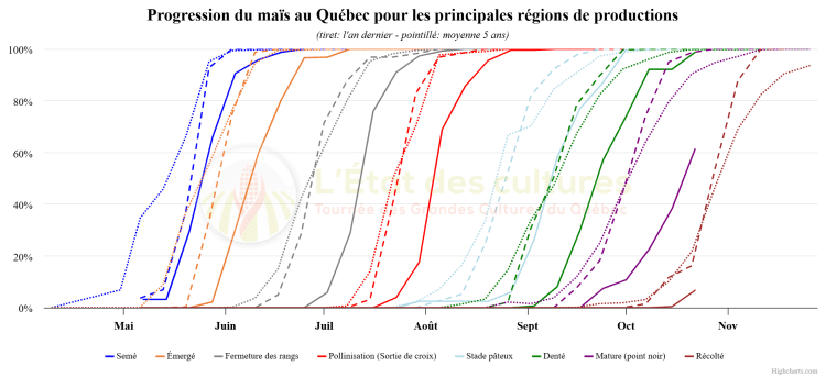 Les récoltes de maïs-grain ont débuté au cours des derniers jours en Montérégie et au Centre-du-Québec, alors que le soya est bien avancé dans la plupart des régions. La pluie, qui se fait toujours attendre, laisse libre cours aux travaux qui avancent rondement.