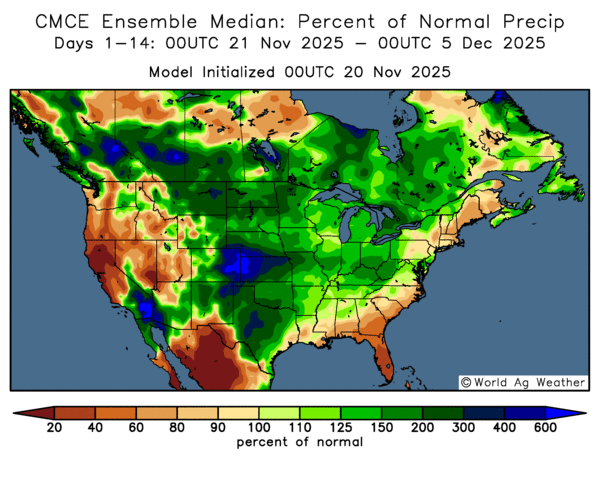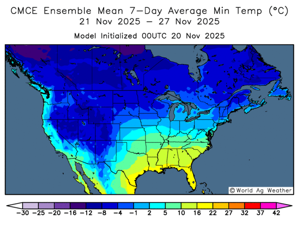 Les prévisions laissent entrevoir des précipitations au-dessus des normales, et des températures minimales qui restent assez près du point de congélation (source: Grainwiz).