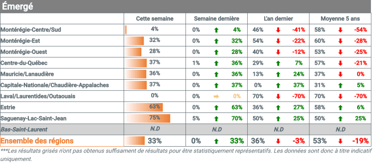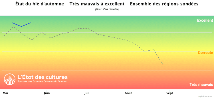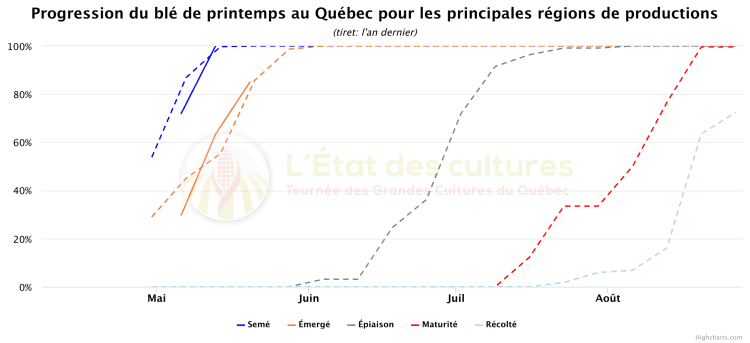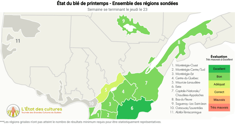 Dans le blé, l’émergence de celui de printemps est en hausse de 22% à maintenant 85%, un léger retard de seulement 1% par rapport à l’an dernier. Pour le blé d’automne, on commence dans quelques régions à observer le début de l’épiaison; en Montérégie-Est et Montérégie Ouest. À pareille date l’an dernier, le stade de l’épiaison était à 4% atteint, contre 1% cette année.
