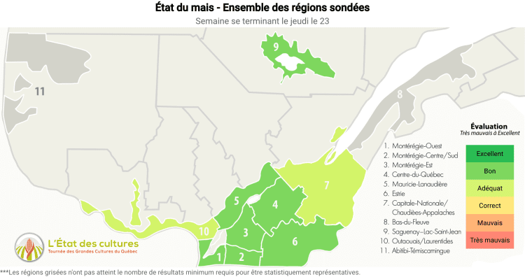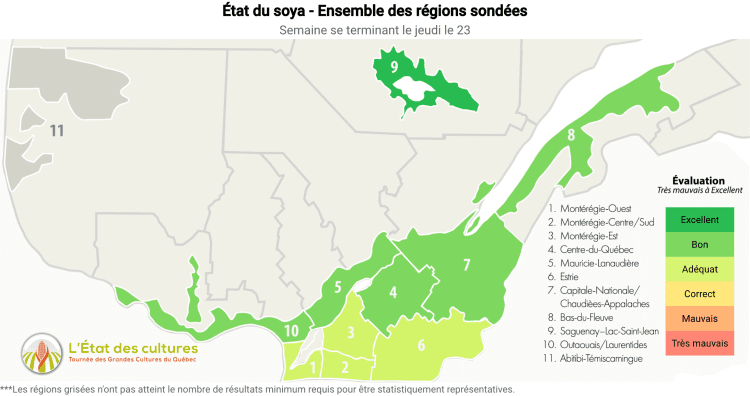 L’optimisme continue de prendre du pic, malgré des conditions en dents de scie et très variables d’une région à l’autre. Ainsi, l’état du maïs selon les observations cette semaine passe de « correcte » à « bon », ce qui est mieux que ce qui était observé à pareille date au cours des dernières années. Situation similaire pour l’état du soya qui passe de « correct » à « bon », mieux que les dernières années.