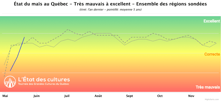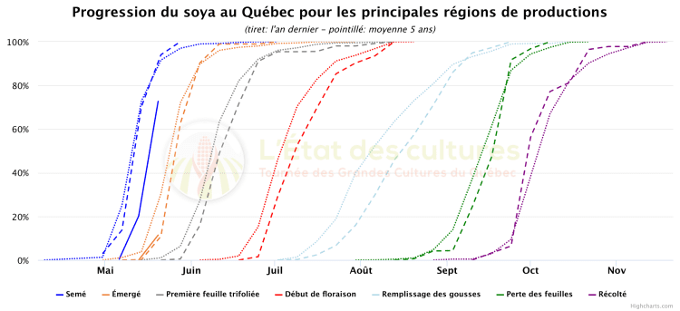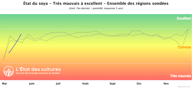 La chaleur aura cependant permis une bonne émergence dans la dernière semaine, le maïs à 33% et le soya à 11%. Il s’agit toujours dans les deux cas d’un retard de 19% par rapport à la moyenne cinq ans. On note cependant que ce retard est beaucoup moins prononcé par rapport à l’an dernier, seulement 1% pour le maïs et même une avance de 1% pour le soya.