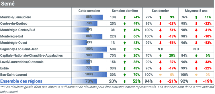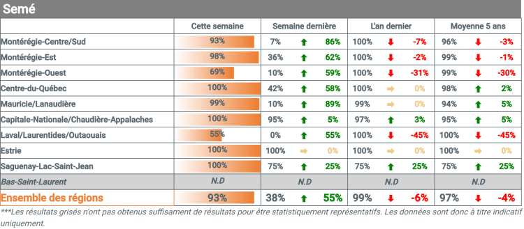 Les ensemencements ont fortement progressé avec le maïs qui passe à 93% complété, un bond de 55% et un retard moins préoccupant de seulement 4% par rapport à la moyenne des cinq dernières années. Même chose pour le soya dont les ensemencements ont bondi de 53% pour atteindre 73% cette semaine. Par contre, dans ce cas-ci, on affiche toujours un retard notable de 19% par rapport à la moyenne cinq ans.