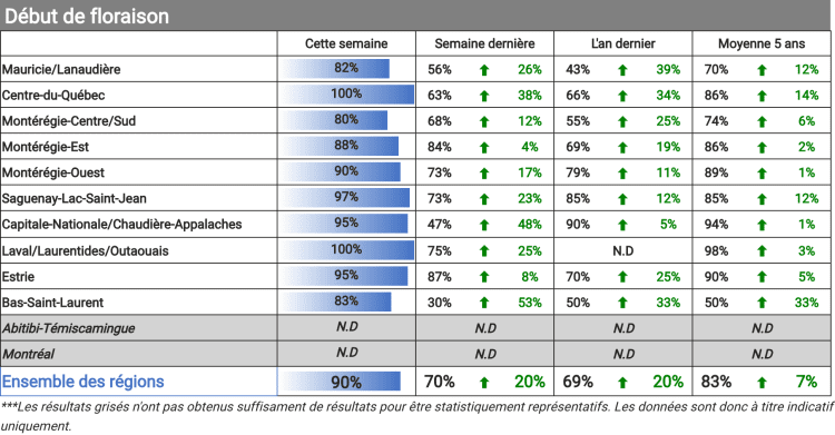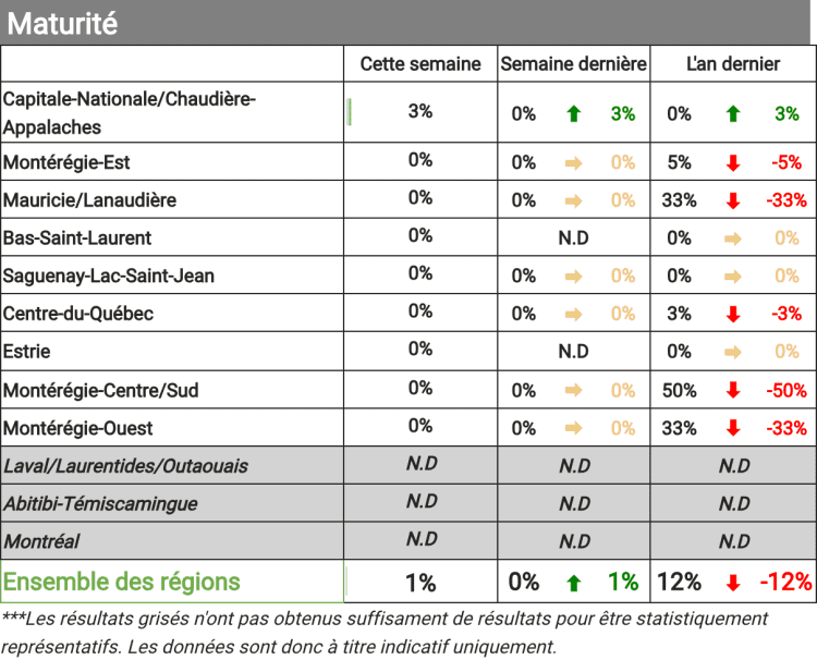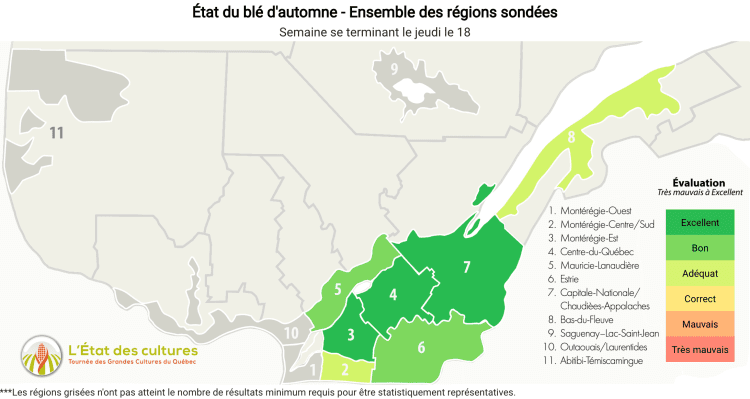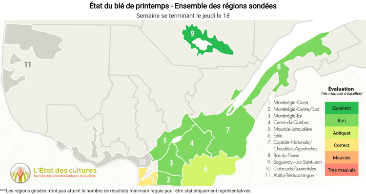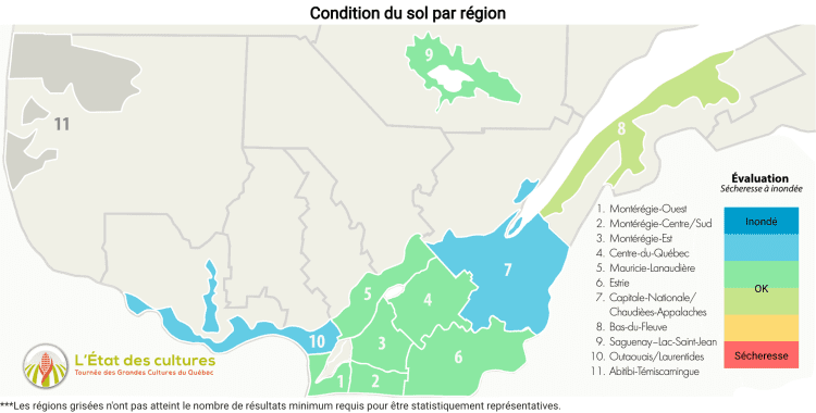 On prend note cependant que certaines régions doivent toujours composer avec des conditions beaucoup plus humides par rapport à la normale, notamment celles d’Outaouais/Laurentides et Montérégie-Centre/Sud. À l’opposé, les conditions sont plus sèches qu’à la normale pour les régions plus à l’est, spécialement les régions du Bas-St-Laurent et du Saguenay-Lac-Saint-Jean.