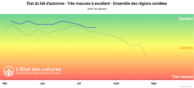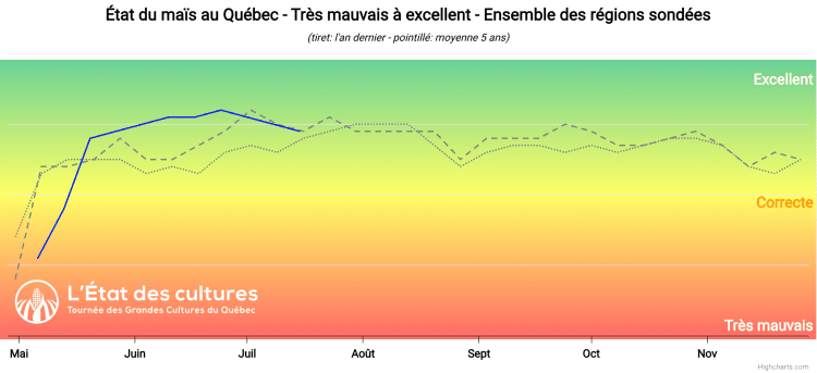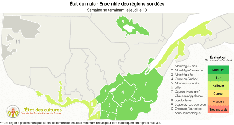 Selon les observations des participants cette semaine, l’état du maïs a poursuivi son léger recul, demeurant néanmoins jugé « bon », un niveau comparable à ce qui était observé à pareille date l’an dernier.