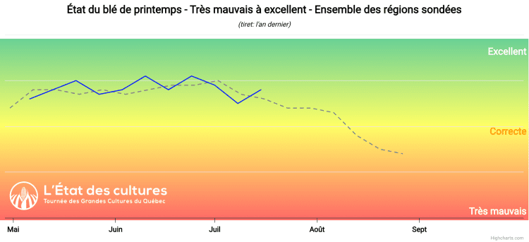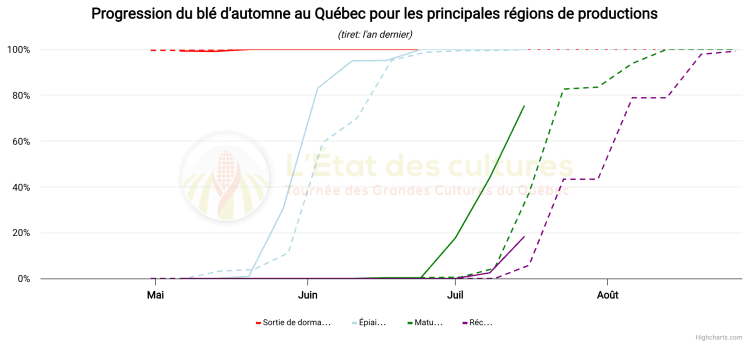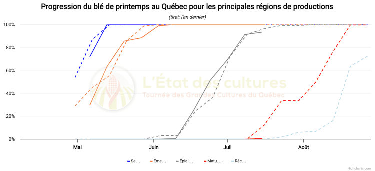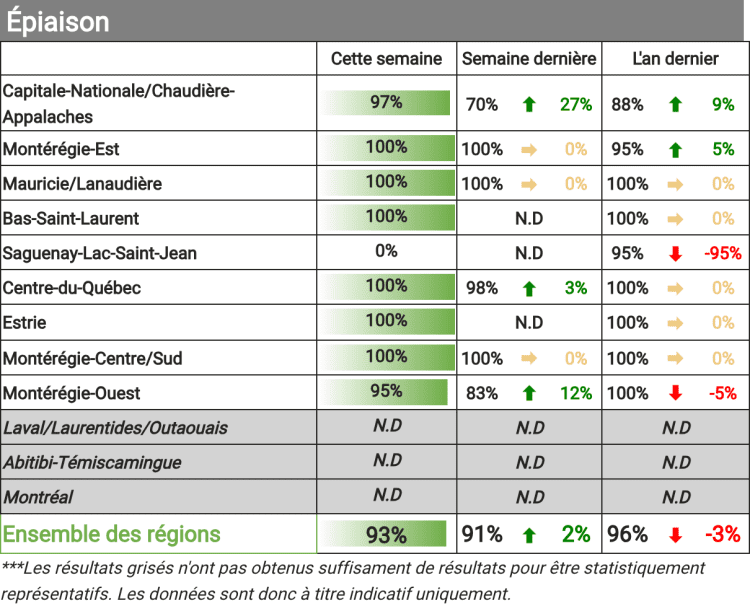 Enfin, dans le blé, l’épiaison atteint maintenant 93% dans le blé de printemps avec un début du stade de la maturité signalé par un participant dans la région de Capitale-Nationale/Chaudière-Appalaches.